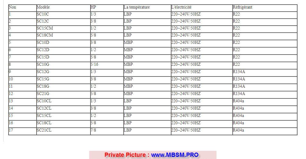 | Non | Modèle | HP | La température | L’électricité | Réfrigérant |