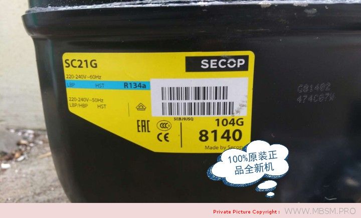 Compressor Danfoss Secop SC21G, SC21GX, 104G8143, LBP / HBP – R134a, 220-240V/1/50/60/ Hz, discharge 20.95 cm3, motor type CSR, oil type POE, oil charge 550 cm3, 333 W at -25 / 55° C, LRA 21.8 A, maximum refrigerant charge 1300 g, height: 219 mm, weight 13.5 kg