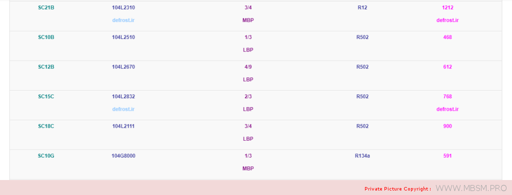 | SC18C | 104L2111 | 3/4 LBP | R502 | 900 | FR6G | 103G6660 | 1/5 MBP | R134a | 351 |