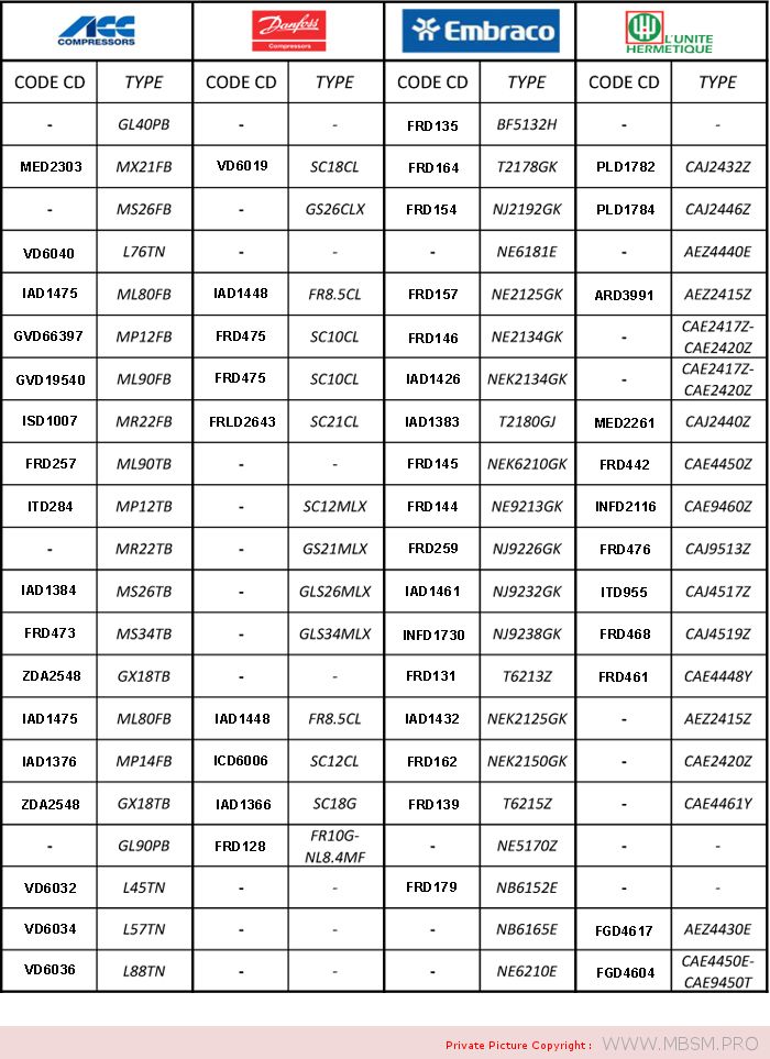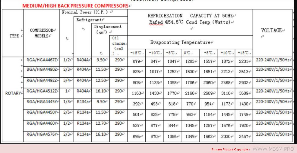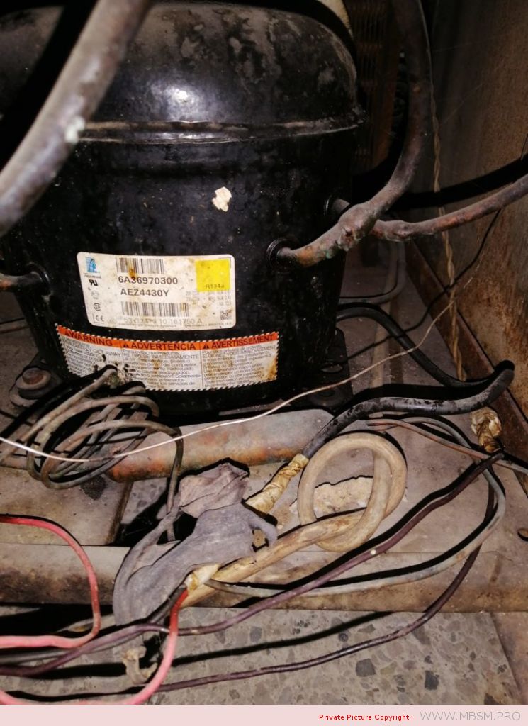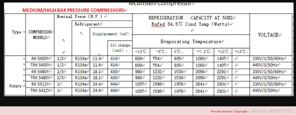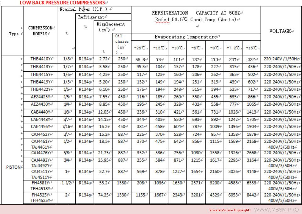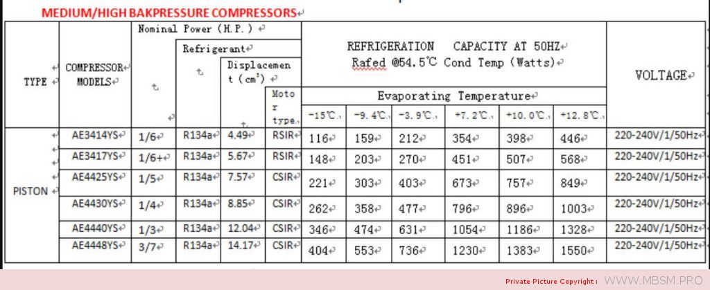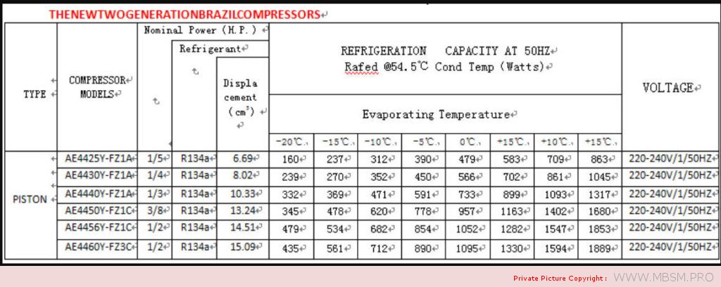Compressor Tecumseh L` Unite AE4430Y/AEZ4430Y, HBP – R134a, 220 – 240V, 50 Hz, 1 phase, discharge: 8.02 cm3, oil type: POE, oil charge: 280 cm3, electrical equipment CSIR, cooling power: 702 W at +5 / +50 °C, connection: suction: 1/4 inch, discharge: 3/16 inch, sound level: 56 dBA, start capacitor: 50uF/250V, expansion device: capillary or with expansion valve, cooling: forced, height: 200 mm, weight: 9.7 kg