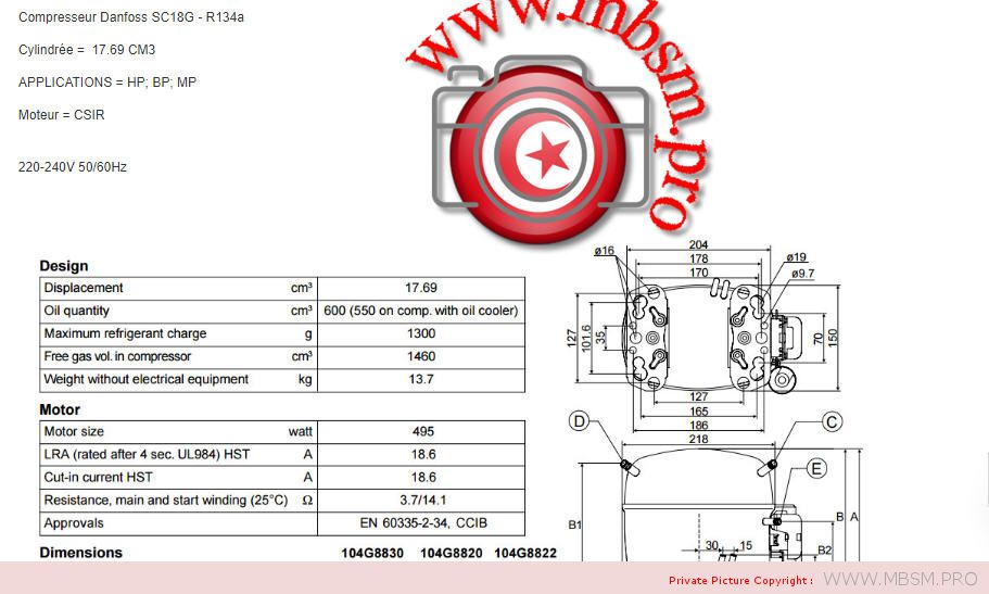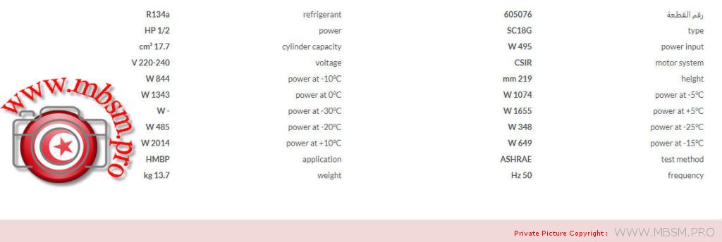 | Résistance de l’enroulement auxiliaire (enroulement de démarrage) pour compresseurs monophasés [ohm] | 14.1 Ohm |