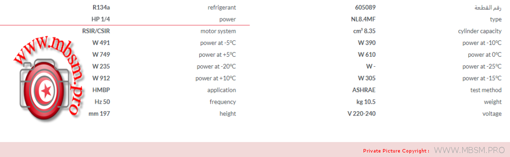 FICHE TECHNIQUE COMPRESSEUR DANFOSS NL8.4MF AU R134A 1/4HP 8.35CM3