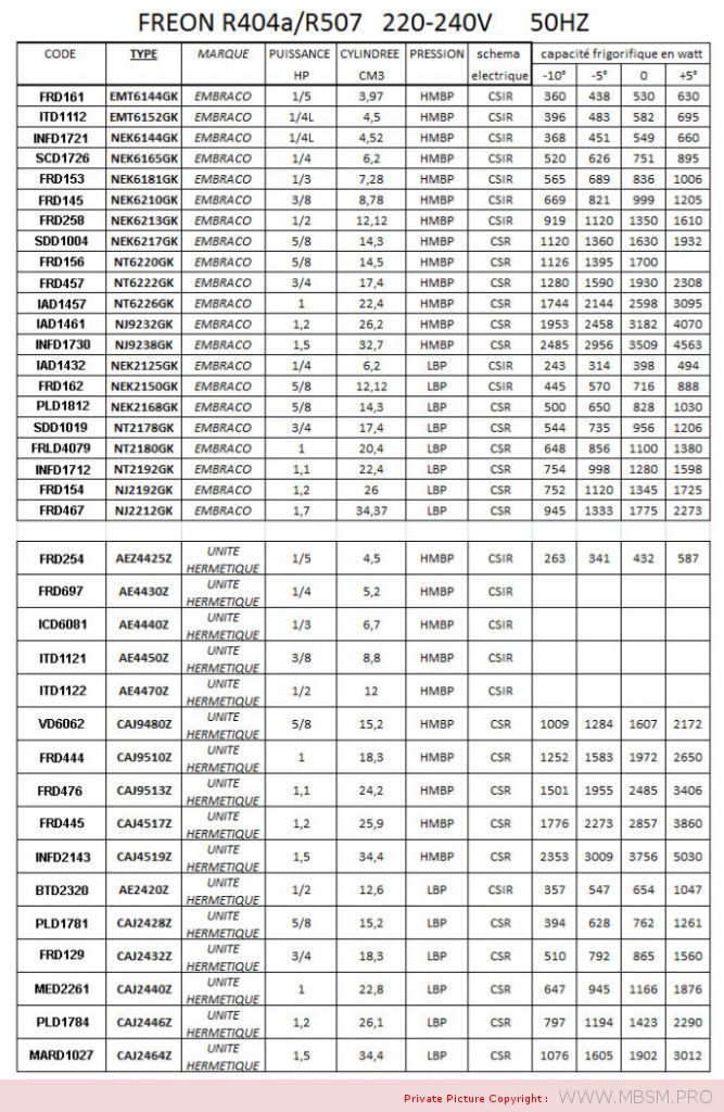 | Code | Prix | Type | Marque | Puissance HP | Cylindrée CM3 | Pression | Schéma électrique | Capacité frigorifique en watt-10°C-5°C0°C+5°C |