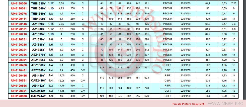 UH0120111 THB1360Y 1/6 6,1 250 C 76 105 141 185 238 300 PTCSIR 220/1/50 129 0,88 11