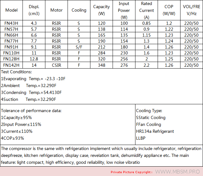 | Series | Model | Displace ment(cm) | Capacity(w) | Input power(w) | C.O.P | Current(A) | Cooling Type | Motor Type | HP |