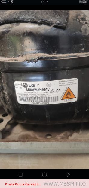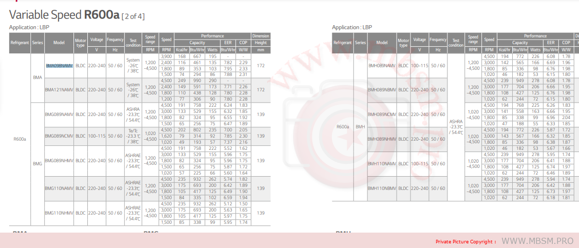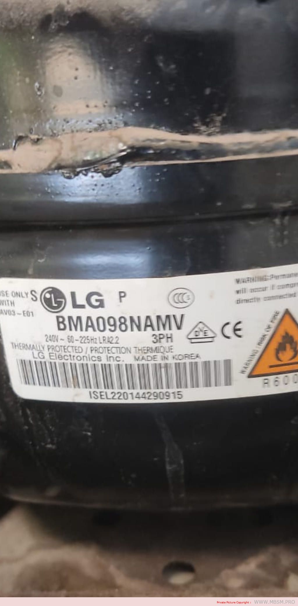Mbsm.pro, LG, Compressor, BMA098NAMV, 1/4 hp, Series: BMA, BLDC, 9.8 cc, R600a, 240V 60-225Hz, Inverter, 667 btu, 195 w