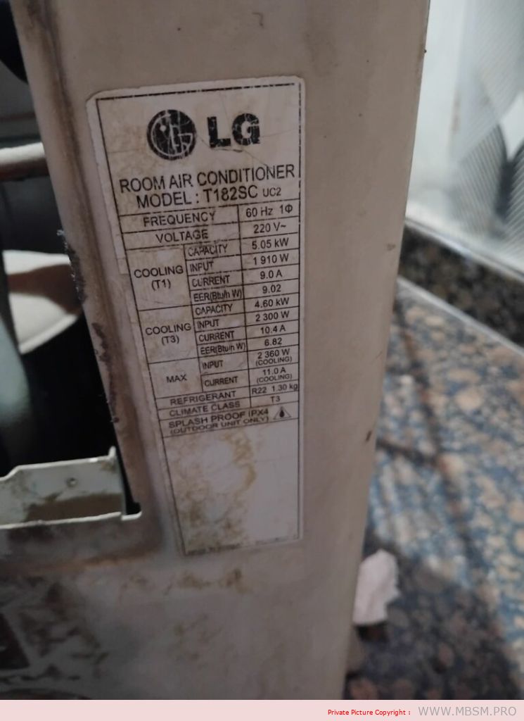 - LG Split Air Conditioner (S18ATC): A 18000 BTU unit with R22 refrigerant, designed for residential use.