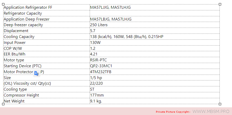 LG, MA57LJJG, Refrigerator, Compressor, 1/5hp, LBP, r134a, 160w, 548btu