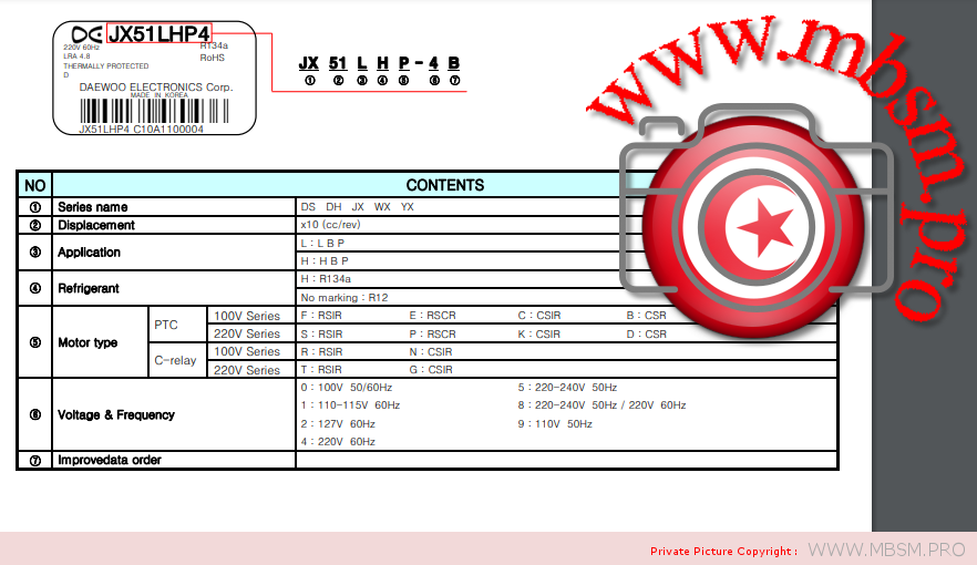 Mbsm.pro, DL25YE-4, 1/4 hp , 1Ph, DAEWOO,COMPRESSOR, R12, CSR, compressor, LBp, 220V 60hz