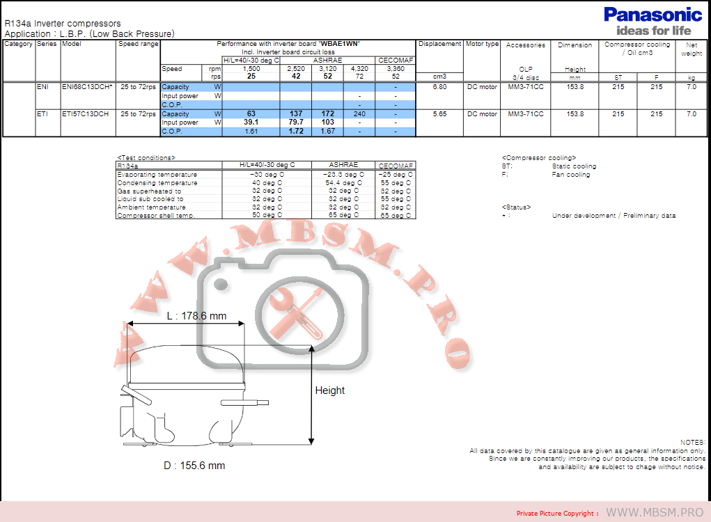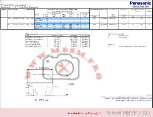 Mbsm.pro, compressor, Panasonic, Lbp, E Series, R134a, ETI57C13DCH, ENI68C13DCH, Reciprocating, Compressors, Variable Speed, inverter, from 63 to 240 w, 240v+-, from 60 to 268 hz, from 25 rps to 72 rps