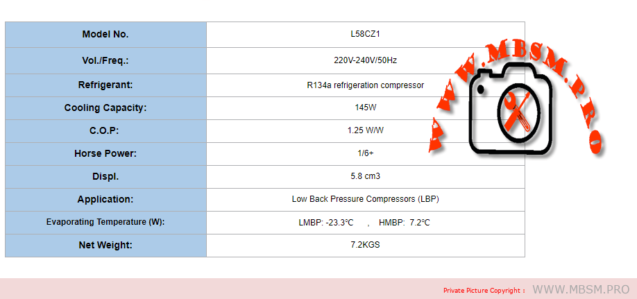 | R134a | LBP | L58CZ | L | 1/6 + | S | RSIR | 220/50 | 140 | 102 | 1.2 | 0.94 |