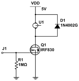 D1 is an added external diode to offer the transistor back-EMF protection. It is not required when using a transistor such as the IRF830 because it already has an internal diode for the same purpose. It is shown here simply to show how it should always be connected when using a transistor without an internal diode. It will be omitted from future circuits unless necessary.