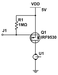J1 (the MOSFET gate) is typically connected to a micro-controller pin. A LOW signal turns the MOSFET ON energizing the motor; a HIGH turns the MOSFET OFF stopping the motor – LOW = motor ON; HIGH = motor OFF.