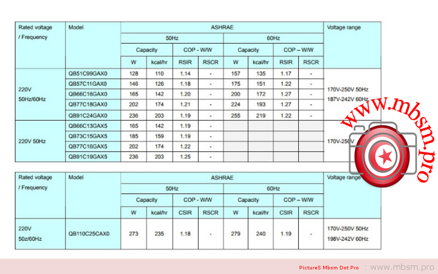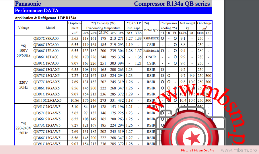 Mbsm.pro , Qb73c15gax5 ,R134a , Refrigeration Compressor ,1/4 Hp, Panasonic compressor catalogue, QB series , 1Ph , 220V 50Hz