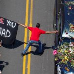 A well-wisher holding a banner touches the hearse carrying the remains of Muhammad Ali during the funeral procession for the three-time heavyweight boxing champion in Louisville, Kentucky, June 10, 2016.