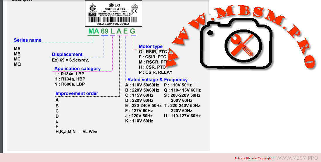 LG air compressor for refrigerators MA62LAEP uses voltage 220V (220V mini air compressor ), at 50Hz, 180W (174W)-cooling capacity using motor Lg kx62laeg refrigerator compressor