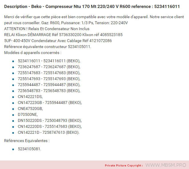 Je cherche un compresseur pour réfrigérateur congelateur BEKO