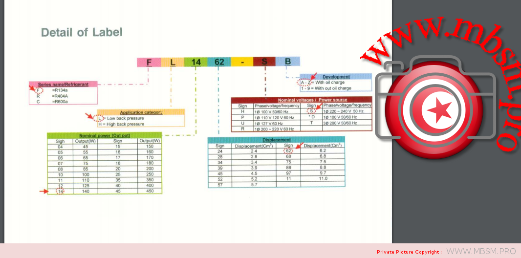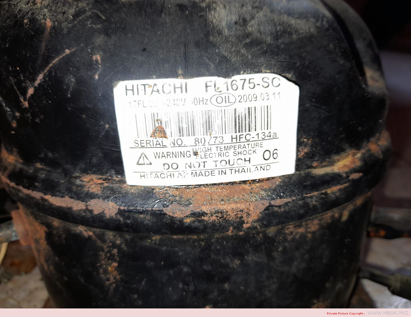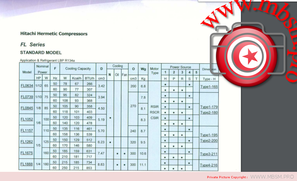 Sangchai refrigeration, Fl series, Rl series, Cl series, Hitachi Compressor, FL1675-sc, 1/5 Hp, R-134A, Low back pressure, 160 w, Deplacement 7.5, 220-240 v 50 hz