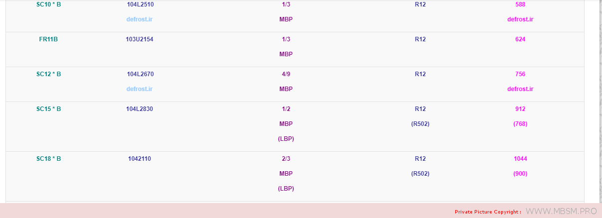 | FR6B | 103U2654 | 1/5 MBP | R12 | 354 | TL3F | 102G4300 | 1/10 LBP | R134a | 58 |