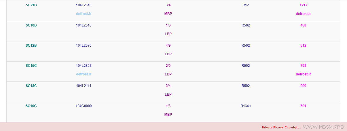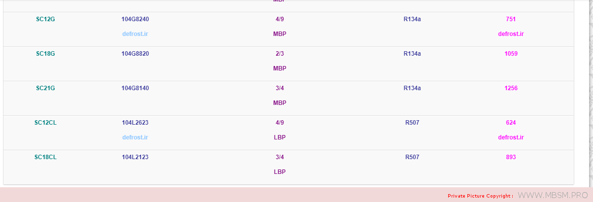 | SC18C | 104L2111 | 3/4 LBP | R502 | 900 | FR6G | 103G6660 | 1/5 MBP | R134a | 351 |