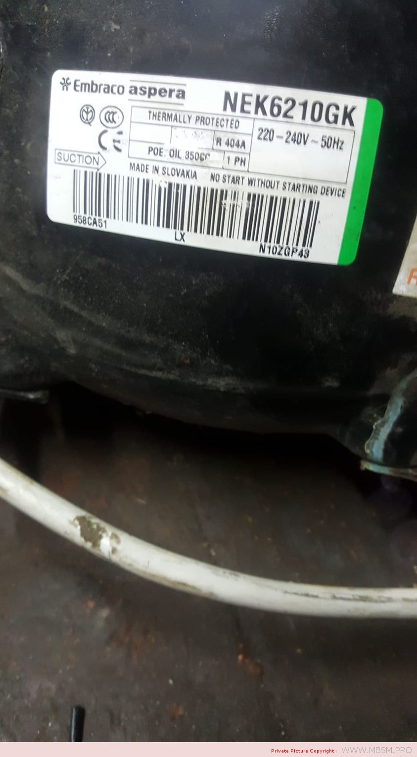 Compressor Embraco Aspera NEK6210GK, MBP – R404A, R507, 220 – 240V/1/50Hz, 1/2 HP, discharge 8.77 cm3, motor type CSIR, lubricant type POE 22, lubricant charge 350 ml.1318 W at +7.2 / +54.4 °, expansion device: capillary or valve, cooling: fan cooling, weight 11 kg