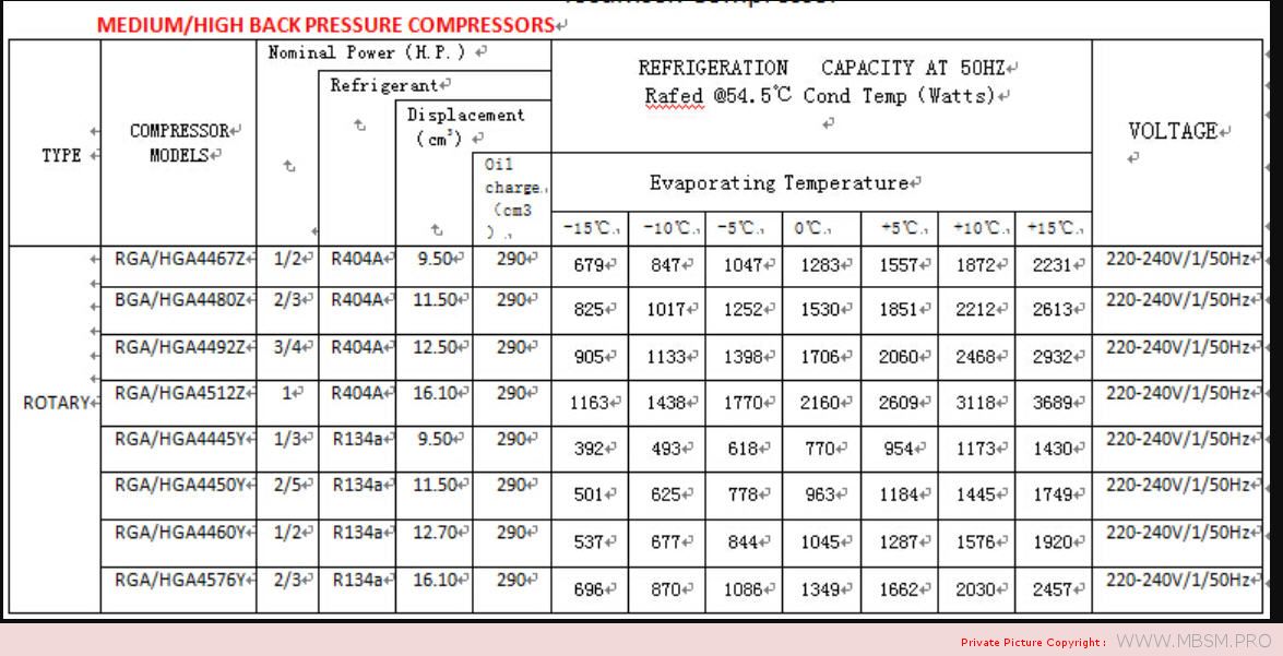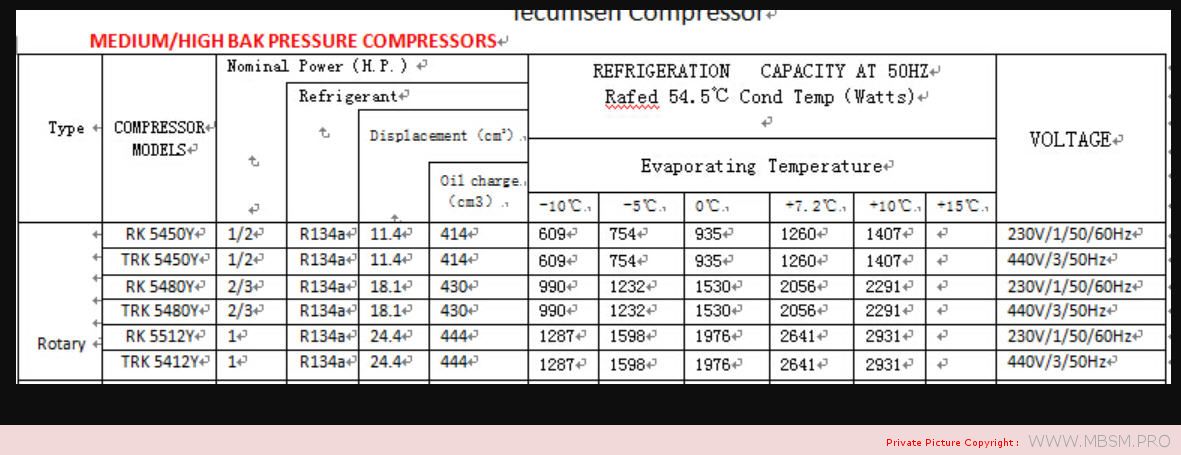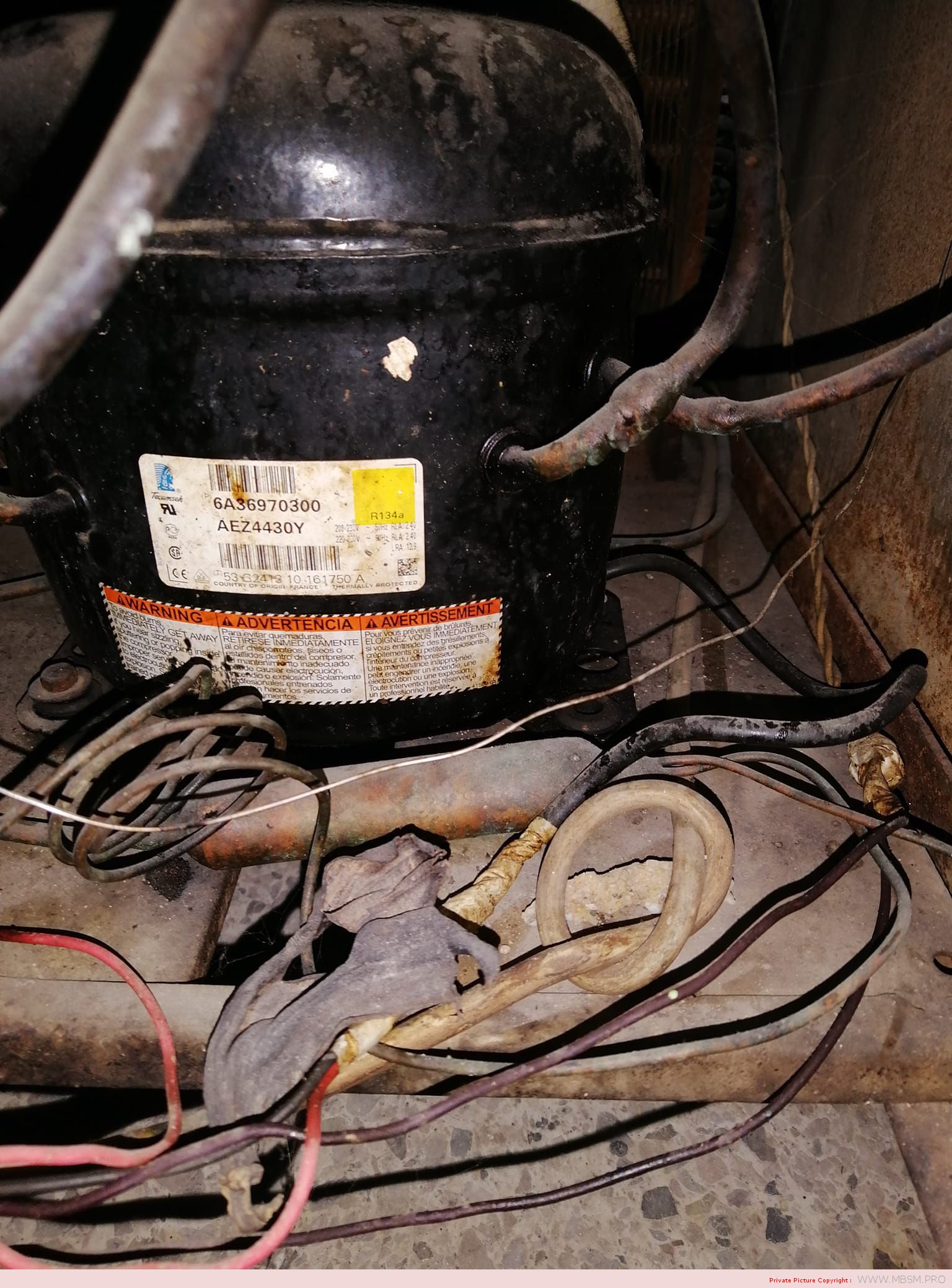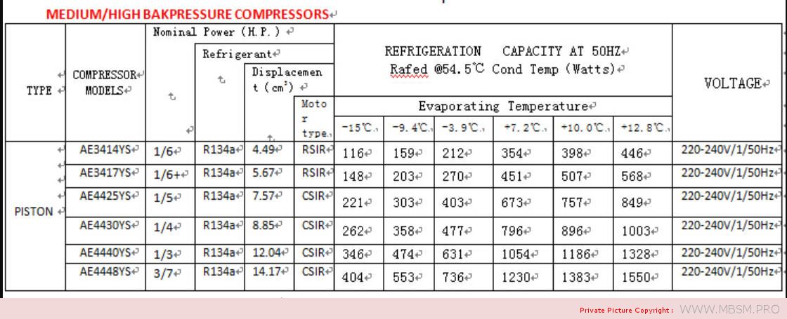 Compressor Tecumseh L` Unite AE4430Y/AEZ4430Y, HBP – R134a, 220 – 240V, 50 Hz, 1 phase, discharge: 8.02 cm3, oil type: POE, oil charge: 280 cm3, electrical equipment CSIR, cooling power: 702 W at +5 / +50 °C, connection: suction: 1/4 inch, discharge: 3/16 inch, sound level: 56 dBA, start capacitor: 50uF/250V, expansion device: capillary or with expansion valve, cooling: forced, height: 200 mm, weight: 9.7 kg