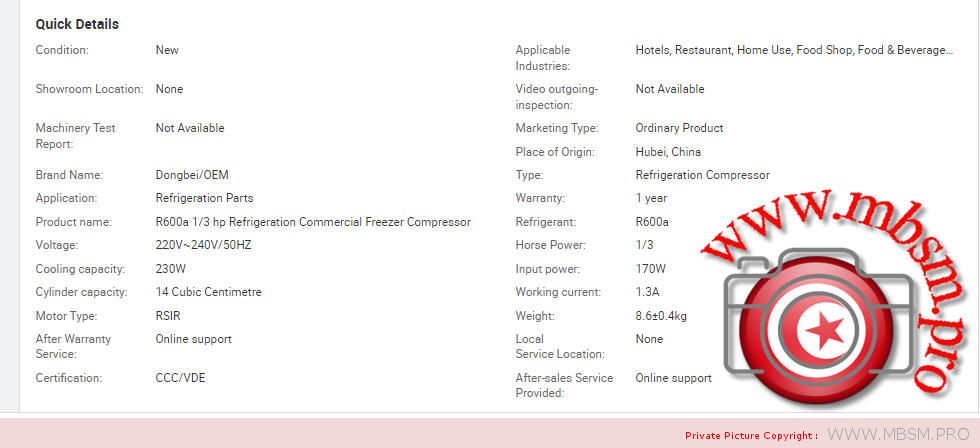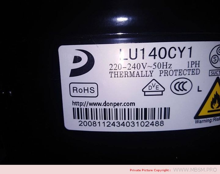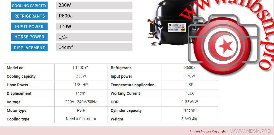 Model no L140CY1 Refrigerant R600a Cooling capicity 230W Input power 170W Hose Power 1/3- HP Temperature application LBP Displacement 14cm³ Working Current 1.3A Voltage 220V~240V/50Hz COP 1.35W/W Motor type RSIR Cylinder capacity 14cm³ Cooling type Need a fan motor Weight 8.6±0.4kg