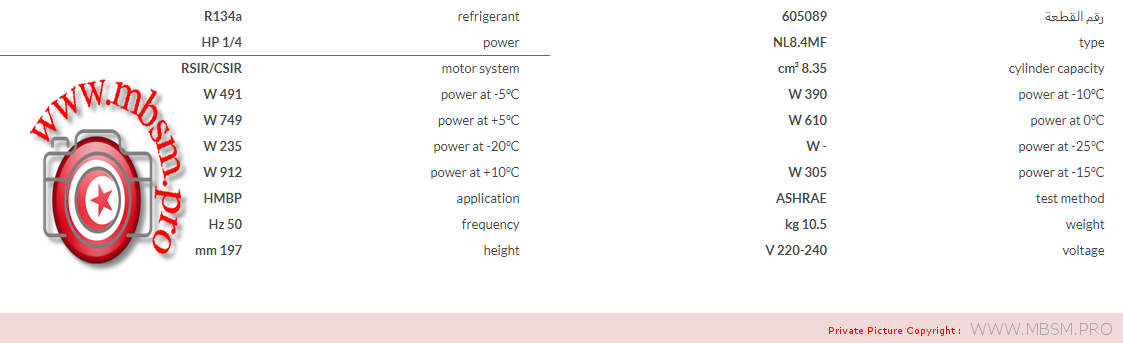 FICHE TECHNIQUE COMPRESSEUR DANFOSS NL8.4MF AU R134A 1/4HP 8.35CM3