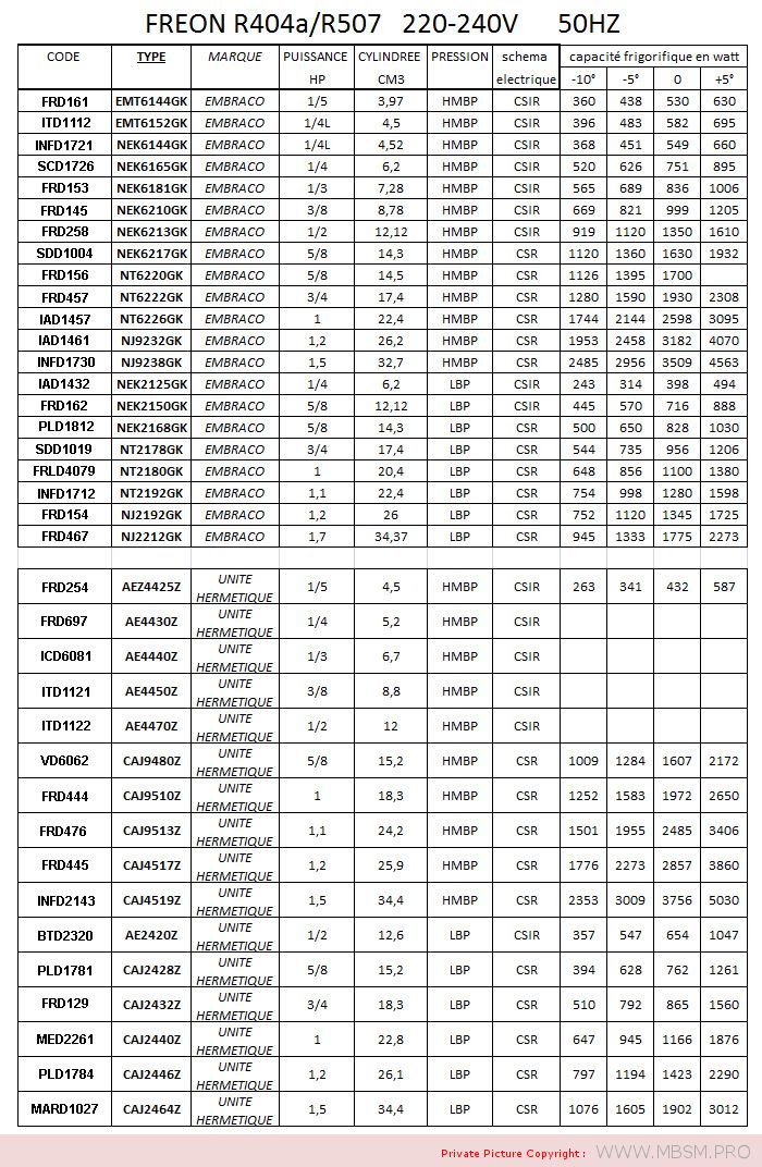 | Code | Prix | Type | Marque | Puissance HP | Cylindrée CM3 | Pression | Schéma électrique | Capacité frigorifique en watt-10°C-5°C0°C+5°C |