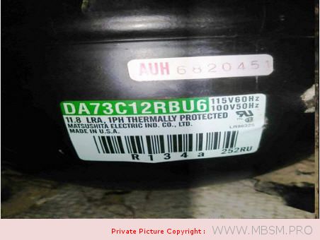 PANASONIC DA73C12RBU6 A/C Compressor, 881 BtuH, 115V. More details: A/C Compressor, BtuH 881, Voltage 115, 1 Phase, Refrigerant Type R-134A, Nominal HP 1/4, 60 Hz, Length 11 In., Width 9-1/2 In., Height 8-1/2 In.