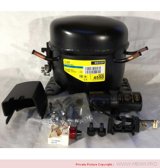 101GL4550, compressor Secop / Danfoss TL5G, MBP / HBP -R134a, 220-240V/1/50/60Hz, discharge 5.08 cm3, motor type RSCR / CSIR, oil type POE, oil charge 280 cm3, 79 W at -25 / 55° C, LRA 5.7 A, maximum refrigerant charge 400 g, height: 173 mm, weight 7.5 kg