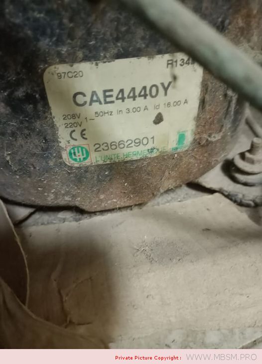 Compressor Tecumseh L` Unite AE4440Y, HBP – R134a, 220 – 240V, 50 Hz, 1 phase, discharge: cm3, oil type: POE, oil charge: 285 cm3, electrical equipment CSIR, cooling power: 886 W at +5 / +50 °C, connection: suction: 1/4 inch, discharge: 3/16 inch, sound level: dBA, start capacitor: uF/250V, expansion device: capillary or with expansion valve, cooling: forced, height: 196 mm, weight: 9.8 kg