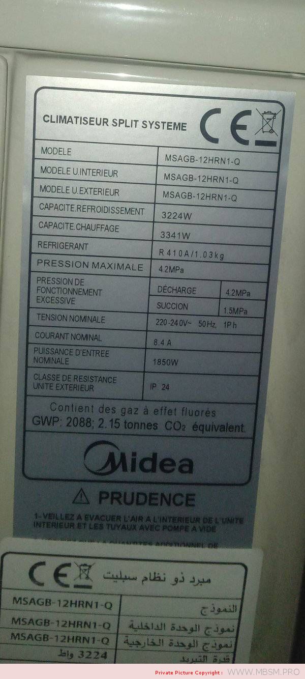 Mbsm.pro, Climatiseur, MSAGB-12HRN1-Q, 12000 Btu/h, R410a, 300g, Chaud et froid, 5 fils, T1 (Méditerranée), 1 phase, 220 V, 8.4 A 13 April 2022 | No Comments AttachmentTypeLinkImageView ImageImageView Image12000 btu/h300g5 filsChaud et froidClimatiseurmbsm.proMSAGB-12HRN1-QR410AT1 (Méditerranée) Tags: 12000 btu/h, 300g, 5 fils, Chaud et froid, Climatiseur, mbsm.pro, MSAGB-12HRN1-Q, R410A, T1 (Méditerranée)