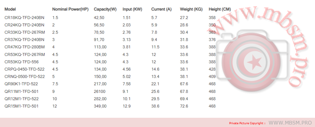 QRI5M1-TFD-501 12 349,00 129 386 726 468odel Nominal Power(HP) Capacity(W) Input(KW) Curent(A) Weight (KG) Height (CM)