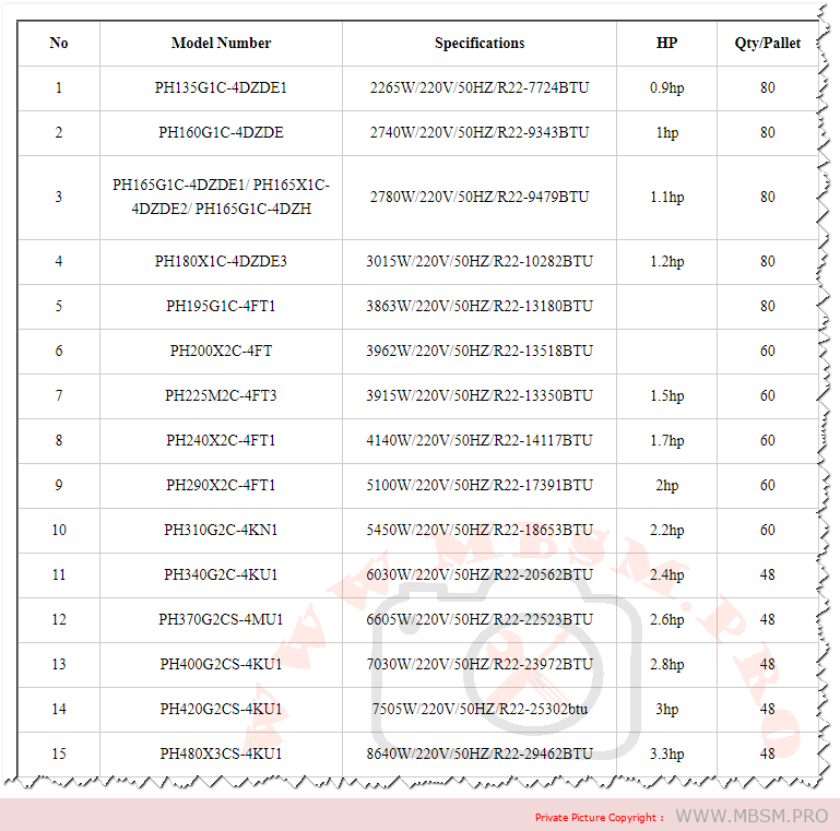 TYPE SPECIFICATION HP PH135G1C-4DZDE1 2265W/220V/50HZ/R22 1HP PH165X1C-4DZDE2 2780W/220V/50HZ/R22 1HP PH180X1C-4DZDE3 3015W/220V/50HZ/R22 1.5HP PH225X2C-4FT 3870W/220V/50HZ/R22 1.5HP PH240X2C-4FT1 4140W/220V/50HZ/R22 1.5HP PH290X2C-4FT1 5100W/220V/50HZ/R22 2HP PH310G2C-4KN1 5450W/220V/50HZ/R22 2HP PH340G2C-4KU1 6030W/220V/50HZ/R22 2.5HP PH370G2CS-4KU1 6605W/220V/50HZ/R22 2.5HP PH400G2CS-4KU1 7030W/220V/50HZ/R22 3HP PH420G2CS-4KU1 7505W/220V/50HZ/R22 3HP PH480X3CS-4MU1 8460W/220V/50HZ/R22 3HP YH480X3CS-4MUC1 8350W/380V/50HZ/R22 3HP PG180X1C-4DZDE3 3120W/220V/50HZ/R407C 1HP PA118M1C-4FZ2 2770W/220V/50HZ/R410A 1HP PA145G1C-4FT1 3530W/220V/50HZ/R410A 1.5HP PA240X2CS-4KU1 5800W/220V/50HZ/R410A 2HP PA270X3CS-4MU1 6670W/220V/50HZ/R410A 2.5HP PA290G2CS-4MU1 7260W/220V/50HZ/R410A 3HP PA290X3CS-4MU1 7180W/220V/50HZ/R410A 3HP PA330X3CS-4MU1 8190W/220V/50HZ/R410A 3HP