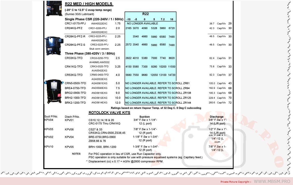 | Remarks | | *Capacity based on (ZR94KC-TFD-523) / DBRE4-0750-TFD NO LONGER AVAILABLE. REFER TO SCROLL ZR94 (See pdf for more details) |