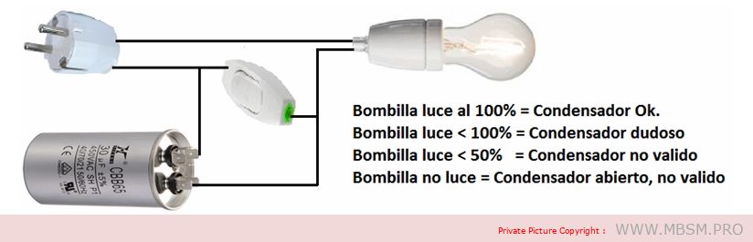 To test a starting capacitor in a simple way, we simply connect it in series with an incandescent light bulb and supply it with AC voltage. We will also complement the assembly with a normally open push button like the one used in doorbells, which we will connect in parallel with the capacitor according to the following diagram.