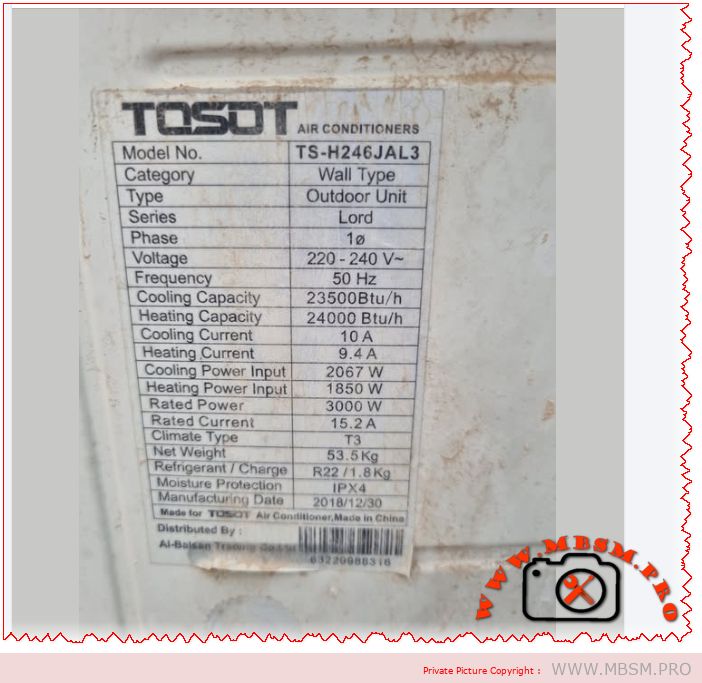 Tags: Mbsmgroup, Mbsm.pro, mbsmpro.com, mbsm, TOSOT, TS-H246JAL3, 2 Ton AC, 24000 BTU, R22 Refrigerant, T3 Tropical Compressor, Panasonic 2K28 replacement, Samsung PH41 replacement.