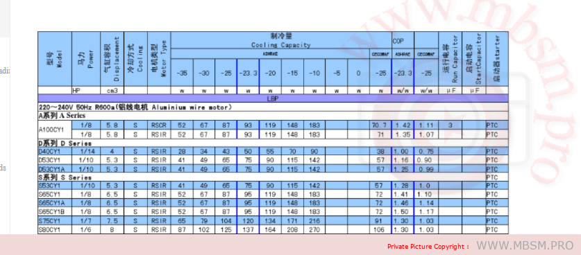 Mbsm.pro, Donper, compressor, aluminum, wire, R600a, R134a, Exemple, a100cy1, 1/5 hp, 93 w, Lbp, R600a