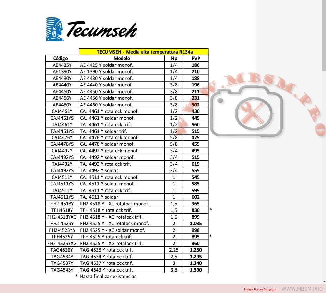 | Modello | HP | Cilindra-ta cm³ | Exp. (1) | Capacità Watt. Te=(°C) | Dim. mm H | Dim. Mm Basamento | Conn. Aspira-zione | Conn. Scarico | Peso netto Kg | I max A |