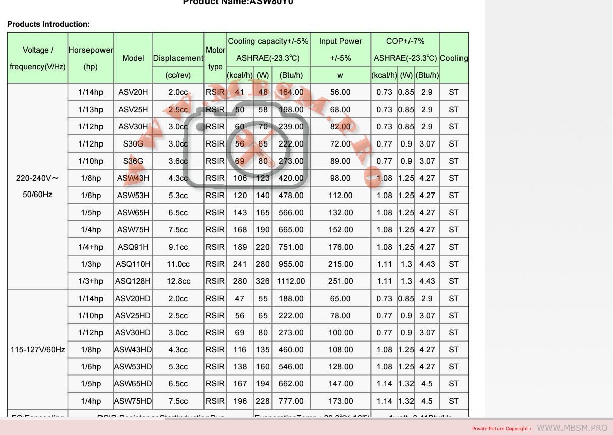 | FC : Fan cooling | RSIR : Resistance Start Induction Run | Evaporating Temp. : -23.3℃ (-10℉) | 1 watt = 3.41 Btu/Hr | ||||||||||