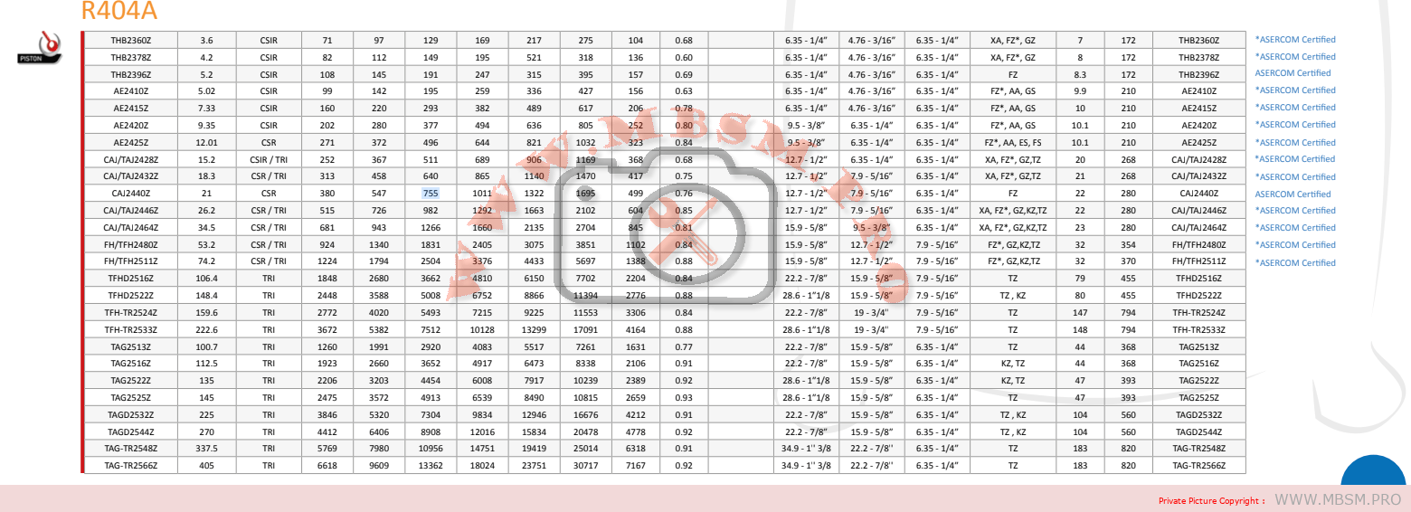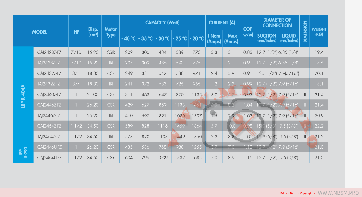 Refigerant R404A / R507 / R449A / R448A / R452A Working range[stC] LBP -40 do -10 Nominal capacity [W] evaporating temperature -10C 2234 Power supply 220V 50Hz Motor type CSR Displacement [cm³] 26,20 Weight [kg] 21,40 Refrigerant: R404A,