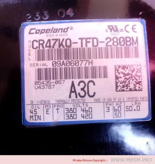 Mbsm.pro, Copeland, Hermetic, CR47KQ, Compressor, Series: CR, 47000 BTU/hr, 10.034 cfm, 460 VAC, 6.9 amp, 4 ton Tonnage, 60 Hz, 3 PH, 3500 rpm, 3.5 hp, 4540 watt, R-22, R-404A, R-407C