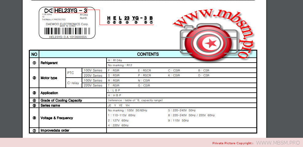Mbsm.pro, DL25YE-4, 1/4 hp , 1Ph, DAEWOO,COMPRESSOR, R12, CSR, compressor, LBp, 220V 60hz