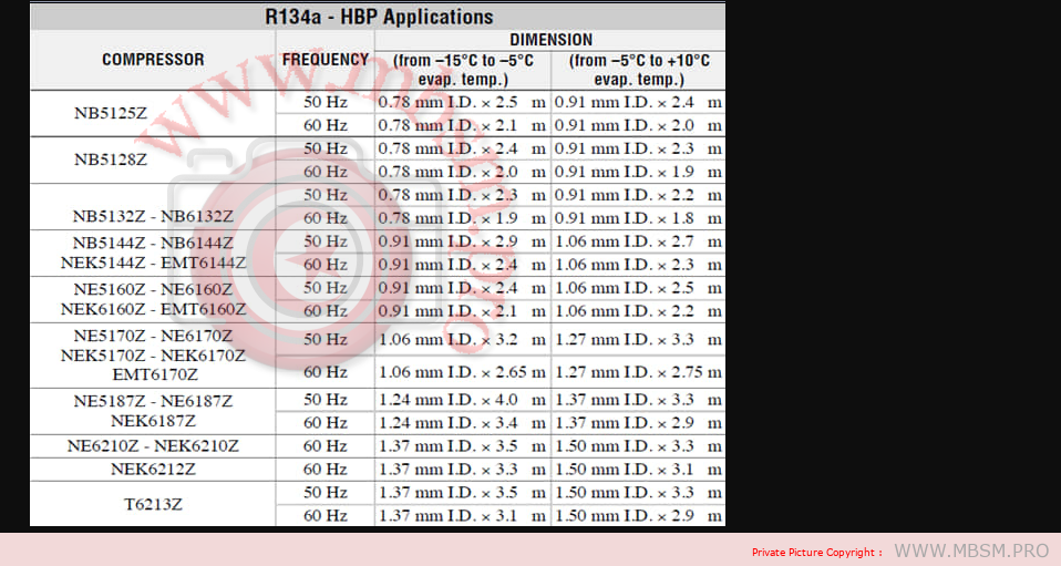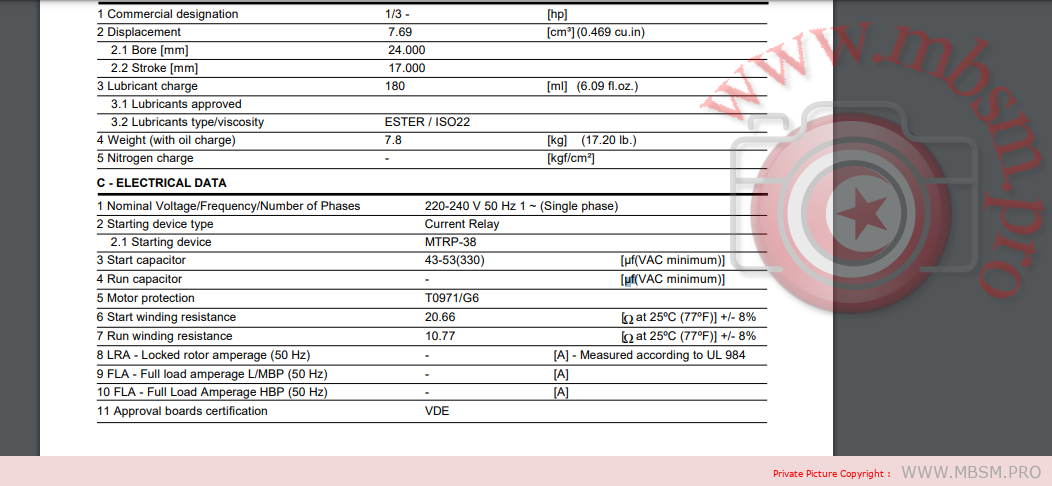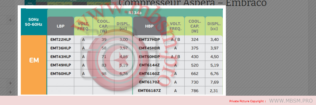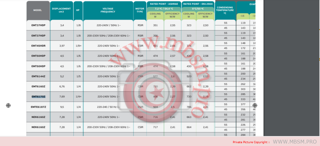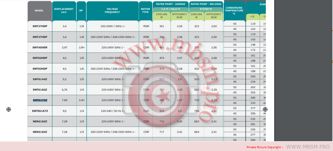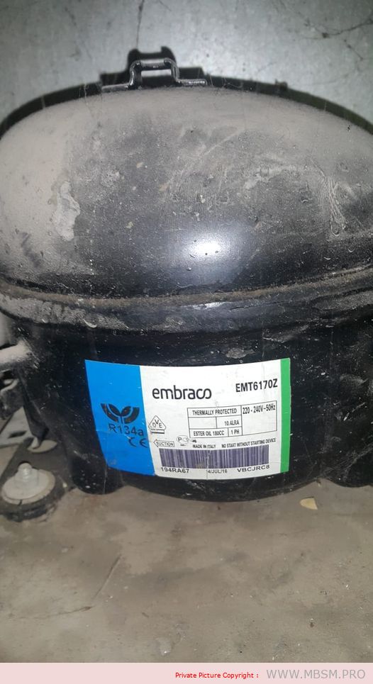 Compressor EMBRACO EMT6170Z, HBP – R134a, 220-240V/1F/50Hz. Power: 1/4 HP. Stroke volume: 7.69 cm3. Motor type: CSIR. Oil filling: POE 22 180 ml. Starting current (LRA): 10.4 A. Power at +7.2 / +54.4 °C: 806 W. Cooling with fan. Air flow: 520 m3/h. Capillary tube/expansion valve operation. Weight: 7.8 kg Cooling capacity measured for condensation temperature 45°C, suction gas temperature 20°C, frequency 50 Hz, measurement conditions: EN12900