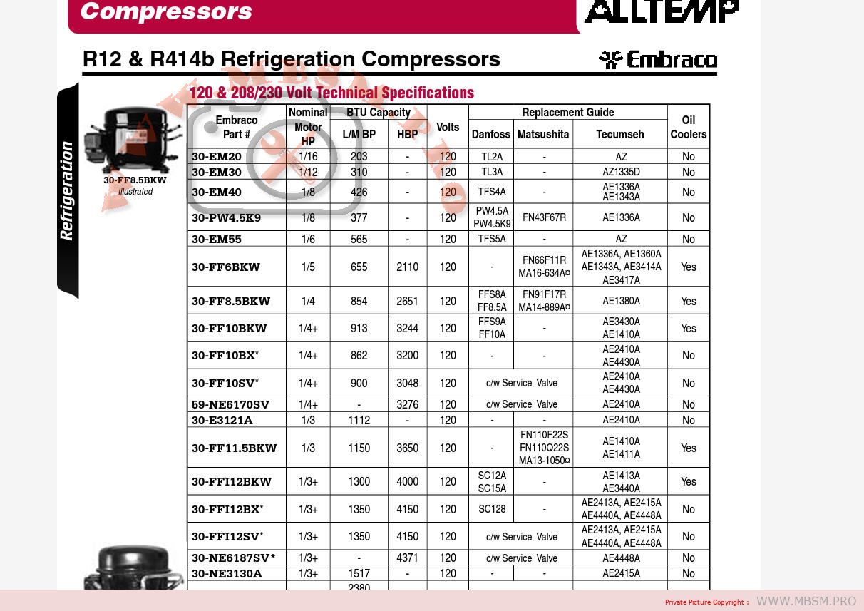 FF10BKW appears to be a compressor model manufactured by Embraco . It is a 1/4+ horsepower compressor that uses inductive resistive start and captive start motors . It is used in refrigeration systems and has been replaced by the 30-FF10BK1 model