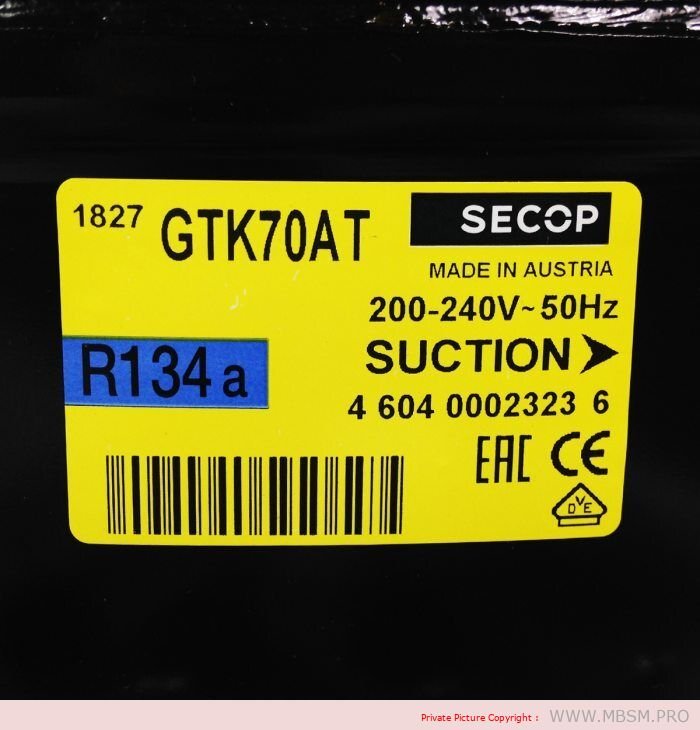 Mbsm.info, Compresseur, Secop, GTK70AT, 204W, R134, LBP, 1/4 HP, RSIR, 699 BTU