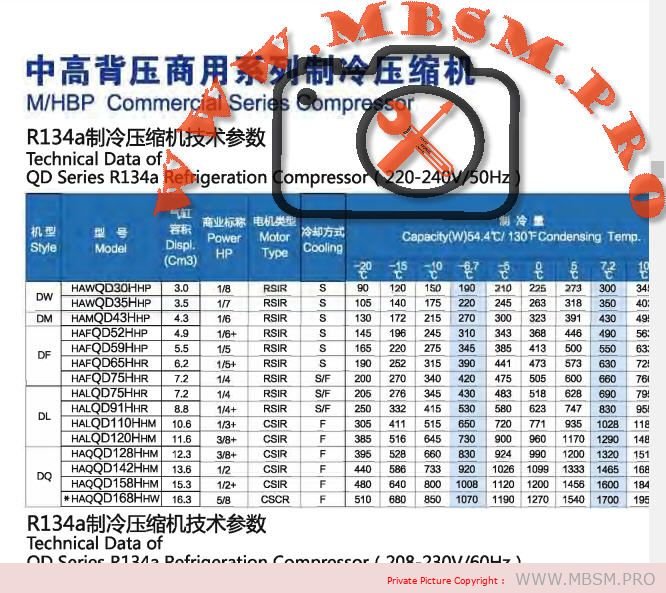 | Model | Compressor Model | Displ. (cm3) | Power HP | Capacity(W)54.4℃/ 130℉ Condensing Temp. | COP W/W | ||||||||||