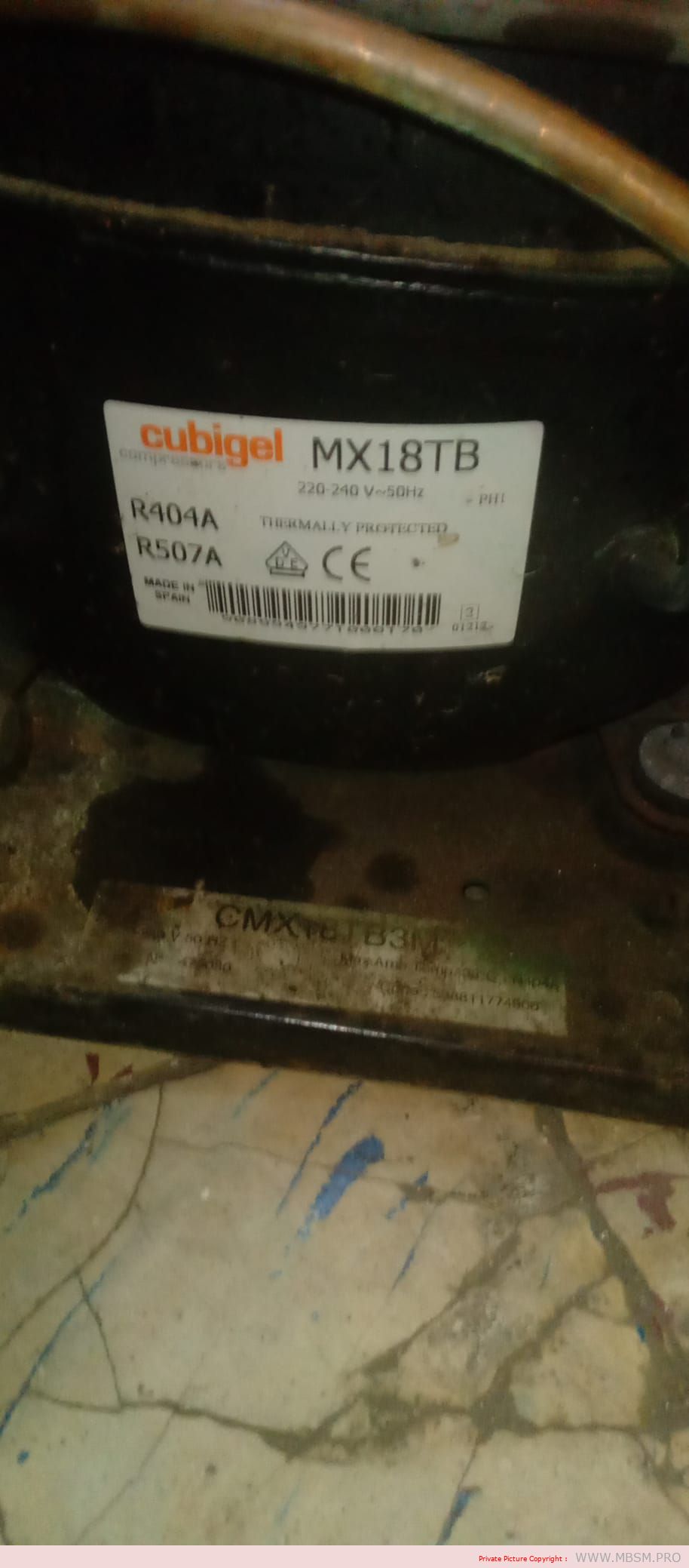 Compressor ACC Cubigel / Huayi – MX18TB, HMBP – R404A, 220-240/50Hz Injection: capillary tube / expansion valve Power: 7/8 HP Refrigerating capacity at -25 / +55°C: 1199 W, power consumption: 2157 W Max Ambient temperature: 43 ºC Displacement: 18.4 cm3 Engine type: CSR Start element: HST Voltage range: 187-264 V Starting current: 29.5 A Oil filling: 500 cm3 Oil type: ISO VG 46 ESTER Weight: 17.2 kg Connections: 9.7 x 6.5 mm Main winding resistance: 2.09 (25ºC) Ohm Winding resistance: 7.95 (25ºC) Ohm. cooling capacity measured for condensation temperature of: 50°C, measuring conditions: ASHRAE