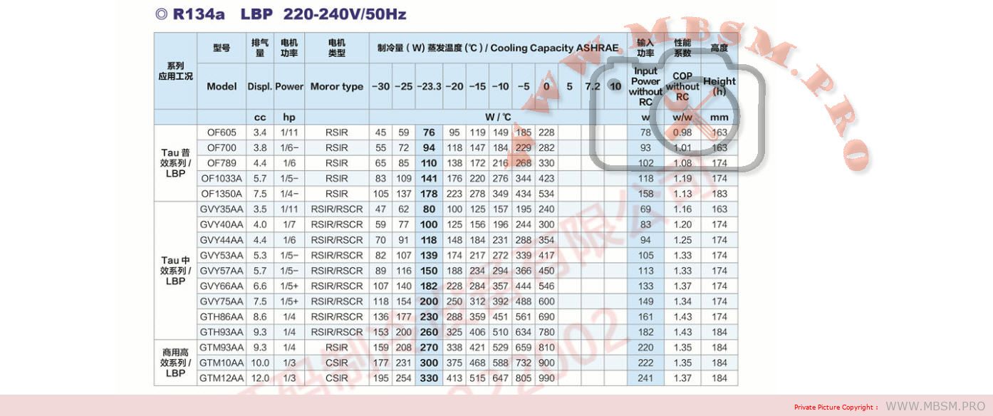 Mbsm.pro, Compressor,Zanussi ,ZEL, OF1033A, 1/5 hp, lbp, 220-240V, 50HZ, R134A